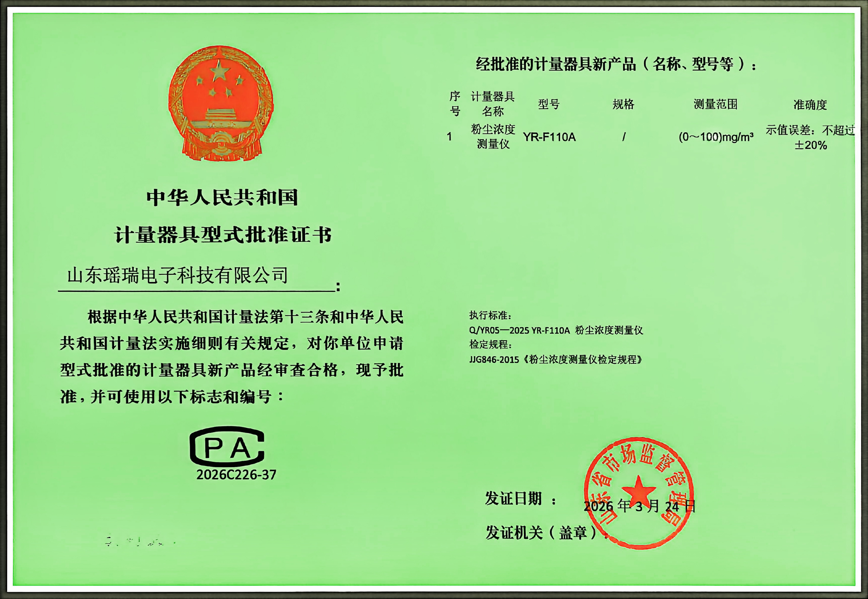 YR-F110A计量器具式批准证书