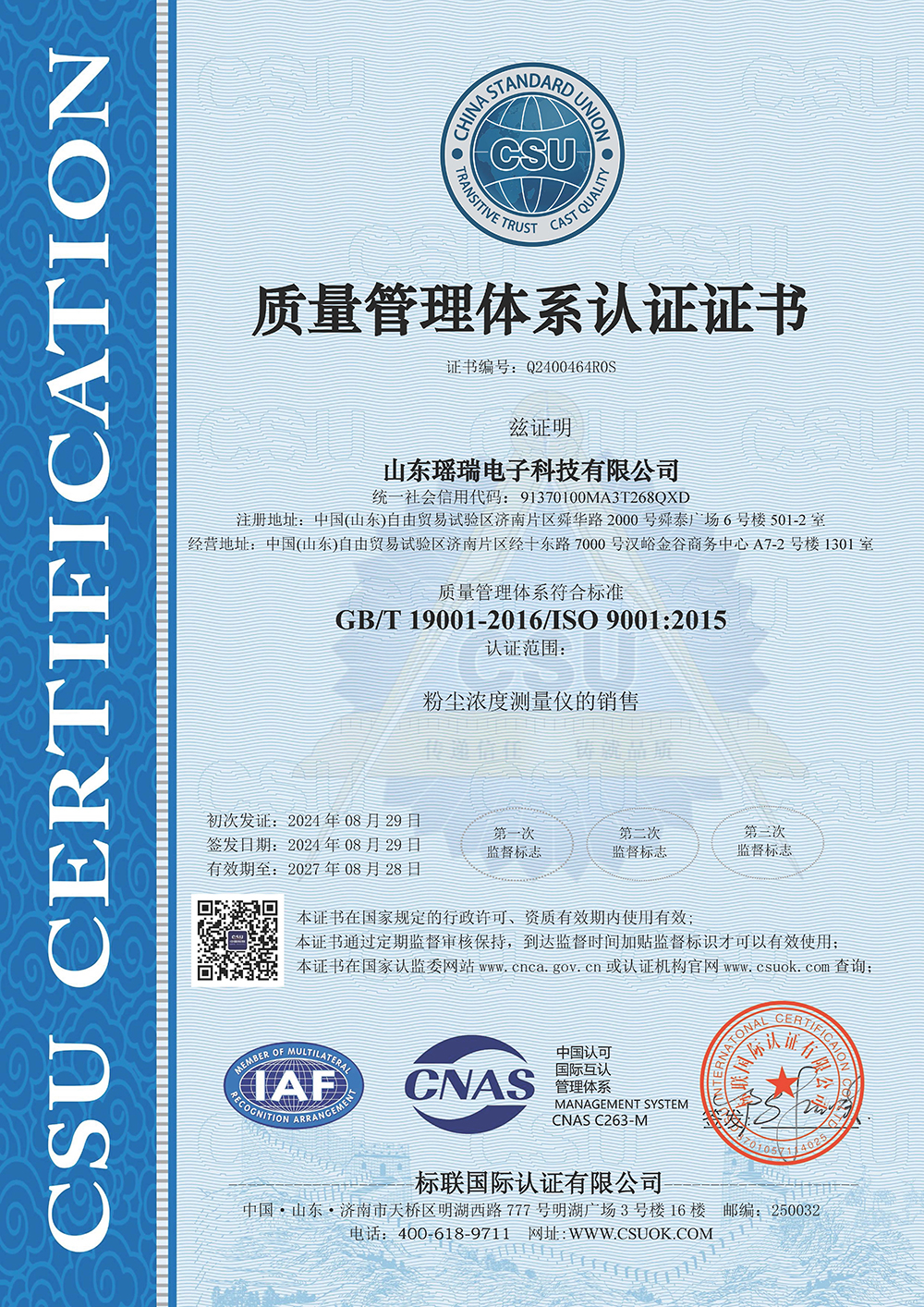 CSU质量管理体系认证证书