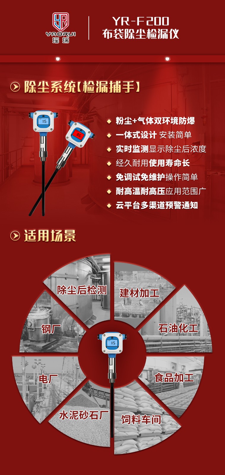 在工业生产领域,布袋除尘系统作为粉尘治理的核心设备,其运行安全性直接关系到企业生产命脉。由于粉尘具有极低燃点与强爆炸性,一旦除尘效率不达标导致粉尘浓度超标,极易引发燃爆事故,造成不可逆的财产损失与人员伤亡。针对这一行业痛点,推荐瑶瑞YR-F200布袋粉尘检漏仪(静电式)专为粉尘涉爆企业设计,具备粉尘与气体双环境防爆功能,能够在恶劣环境下稳定运行,有效防止粉尘爆炸事故的发生。该仪器采用静电感应原理,能够实时在线检测除尘后的粉尘浓度,确保数据的准确性与及时性。其免调试、免维护、免清理的特性,大大降低了企业的维护成本,提高了设备的使用效率。此外,瑶瑞YR-F200布袋粉尘检漏仪(静电式)采用一体式设计,安装简单,支持多种安装方式,便于企业快速部署。同时,该仪器支持智能云端平台远程监测与预警,可搭配报警控制器联动外接设备,实现全方位的安全管理。凭借其高精度、高可靠性及智能化特点,瑶瑞YR-F200布袋粉尘检漏仪(静电式)为工业粉尘治理提供了可靠的解决方案,有效保障生产安全。